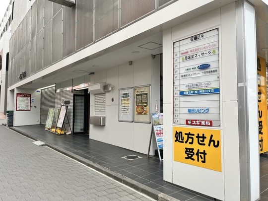 バスのロータリーの先にスギ薬局が入っているビル(佐藤ビル)があります。ここの3Fにコメットセミナーがあります。まずビルの左側面にある入口へ向かって下さい。写真では外階段が見えていますが、その階段は利用しません。↓