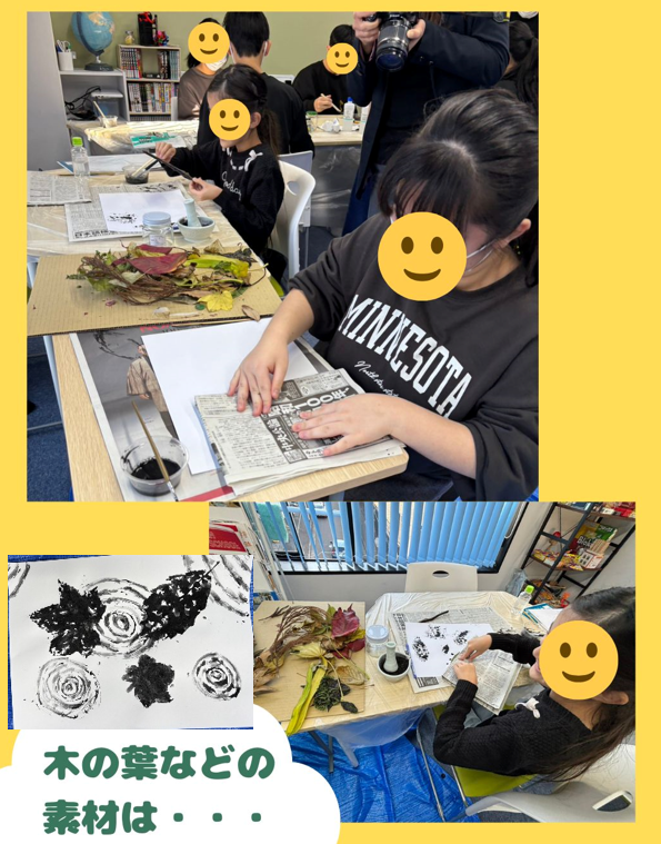 筆に自分で作った墨をつけて好きなもの描いたり、新治の森でとってきた木の葉に墨を塗って版をとったり、自由に創作しました。