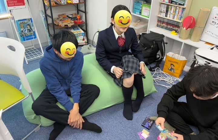 カードゲームの相談をしている所です。ゲームのことなら岩崎先生にお任せを!ヨギボーに座ってリラックスしながら楽しそうです。