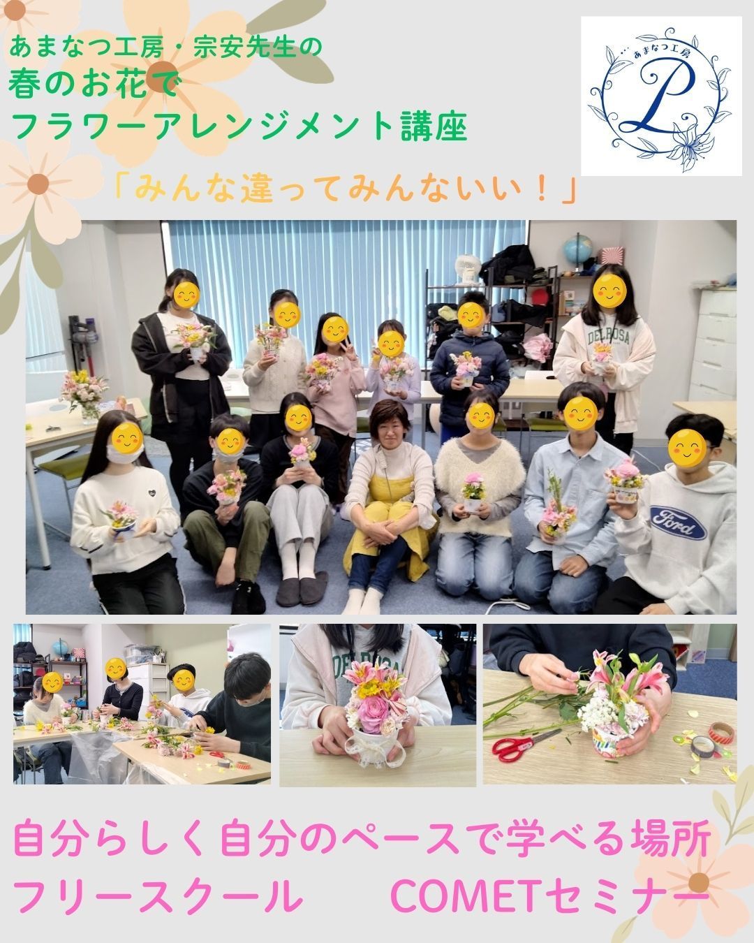こんにちは、コメットセミナーです。先日の活動でフラワーアレンジメント講座を開きました。講師として宗安先生に来ていただき、素晴らしいものがたくさん作られましたので今回のブログではその様子を紹介します。